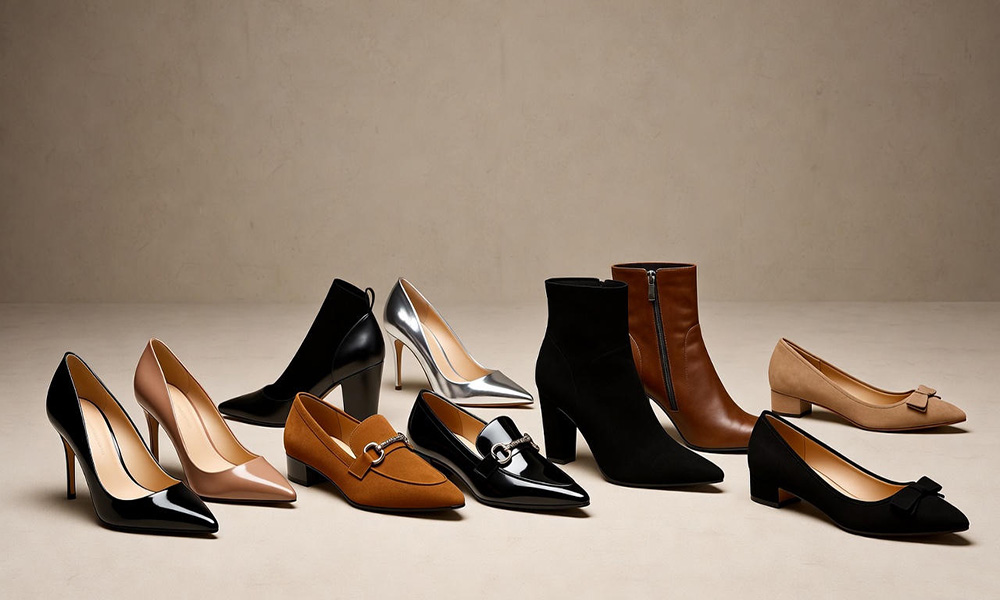 - کفش پاشنهدار (Heels): مانند پمپ (Pumps) یا استیلتو (Stilettos). ایدهآل برای افزایش قد و ظرافت.